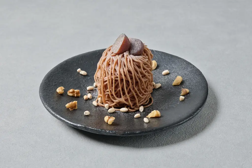 ファーストデザートにはフランス栗のシフォンモンブラン(米粉使用)を提供します。フランス産の栗を使用し、風味が濃厚で上品な甘さを特徴とした一品です。