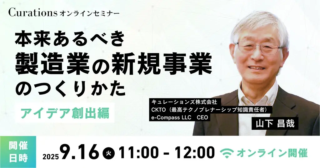 キュレーションズ株式会社は、2025年9月16日(火)11:00〜12:00に無料のオンラインセミナー「本来あるべき製造業の新規事業のつくりかた~アイデア創出編~」を開催します。本リリースは2025年9月11日 15時09分に発表されており、製造業やハードウェア企業、企業内の経営戦略や事業企画に携わる担当者を主な対象としています。
