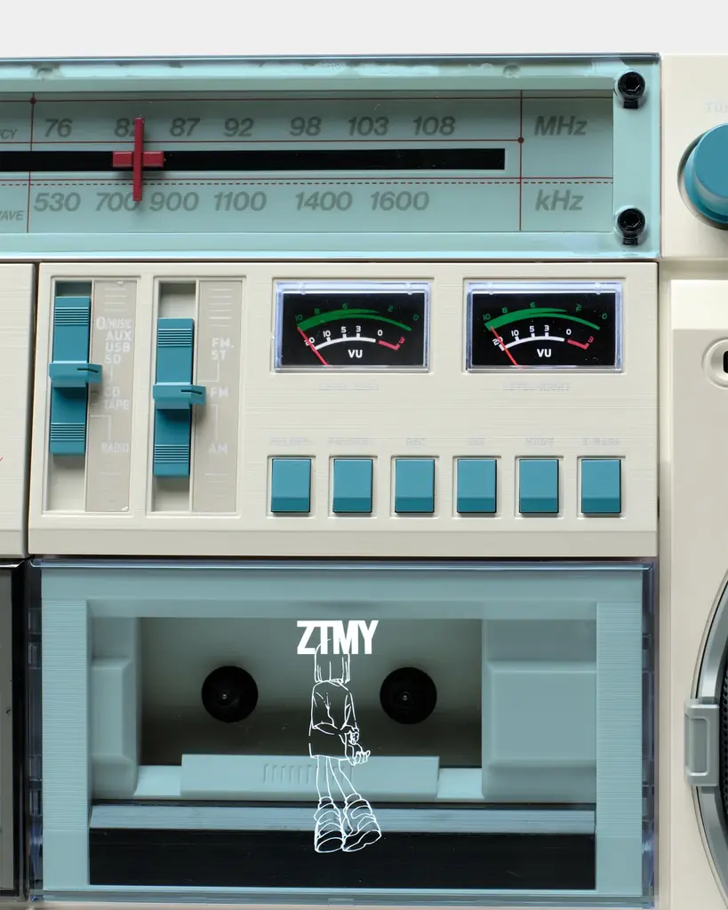 本モデルはキーワードに“内省的コズミック”を掲げ、ラジカセ最盛期への敬意を込めて外装デザインを一新しています。全体のトーンは風合いのあるクリーム色と、インダストリアルなグリーンの組み合わせで仕上げられています。