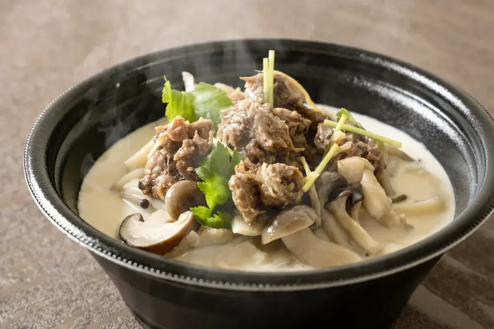 - とうふ屋うかい— 「豆乳肉うどん」1,500円。自家製豆乳×牛コンソメのスープで味わう3種類の豆乳うどんを提供