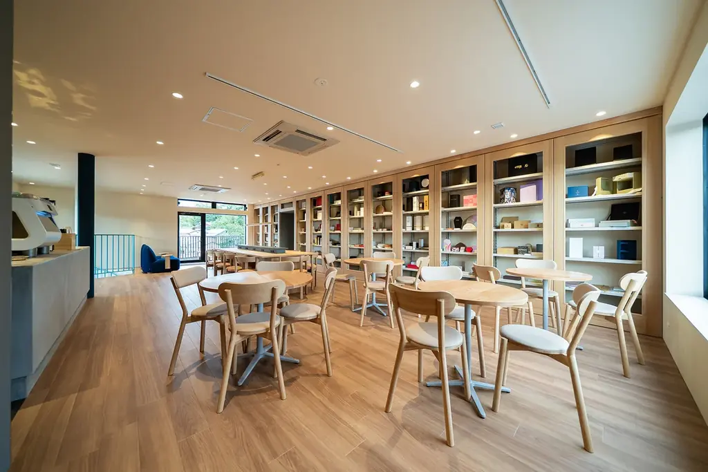 カフェの一角はショールームと隣接し、貼箱のアーカイブやマテリアルサンプルを眺めながら作業や打ち合わせができる設計です。静かな作業の場と、素材に触れる場が同居することで、企画検討の場としても活用できます。