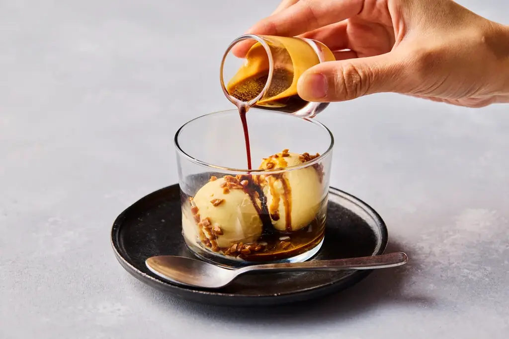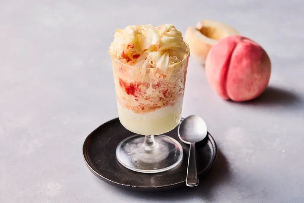 デザートの具体例として、Soyカスタードジェラートのアフォガート(税込¥680)や桃まるごと果実氷(税込¥1,300)などがプレスリリースで挙げられています。店内にはディナーイメージの記載(ディナーイメージ1、ディナーイメージ2)もあります。