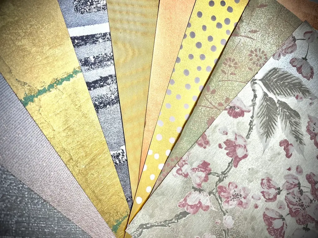 歴清社は三篠町に工場を構え、100年以上の歴史を有する金銀箔押し紙のクリエイター集団です。今回のワークショップでは、工場に眠っていた金銀箔押し紙の端材を提供します。これらの端材は色や柄が豊富で、しおりの表面装飾に適しています。