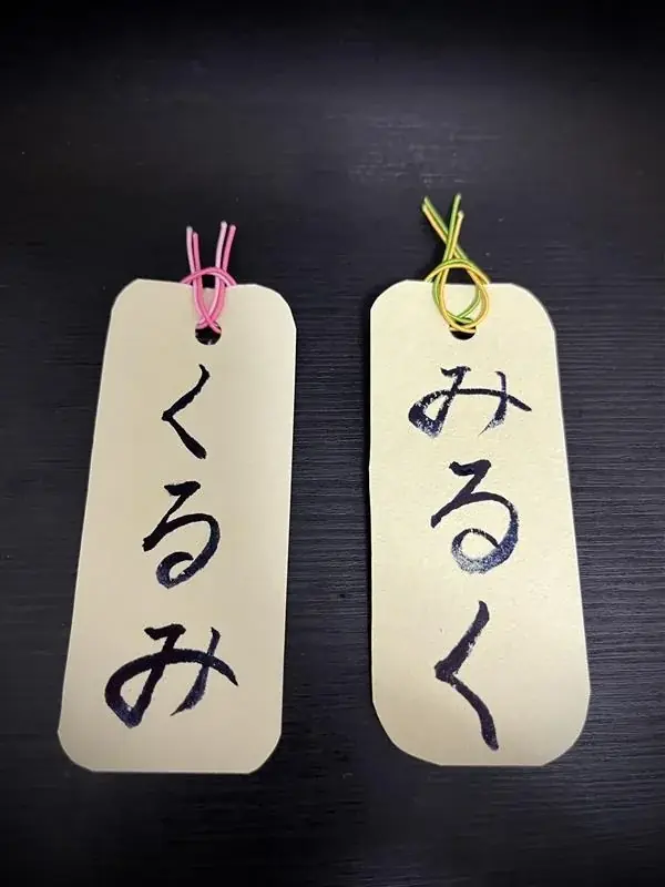 ワークショップではこの熊野筆を用い、通常の墨汁ではなく藍染液で名前入れや絵付けを行います。藍染液による描画は色味や質感が独特であり、参加者は伝統的な筆の使い心地と藍の色合いを体験できます。希望者には書家・美苑による名入れサービスも提供され、外国人参加者には漢字の当て字で名入れを行う配慮もあります。