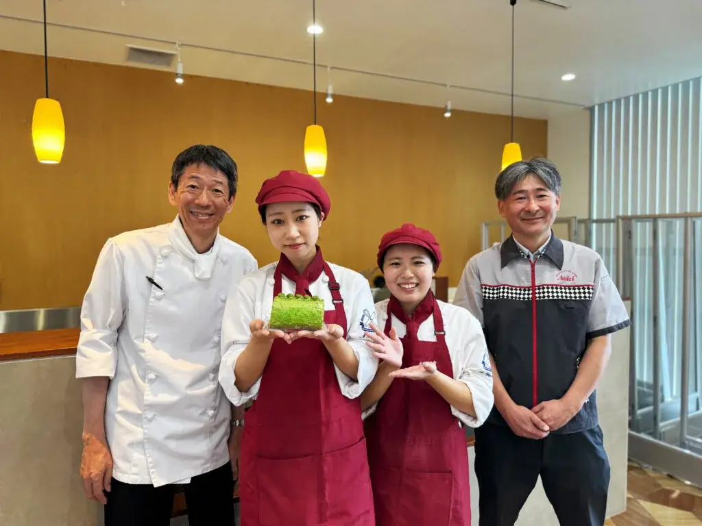 狙いは「本物の抹茶ロール」に近づけることと、地域の食材を前面に出すことです。抹茶の風味を損なわないように甘みや酸味配合を調整し、食後にしつこさを残さない構成を目指しました。