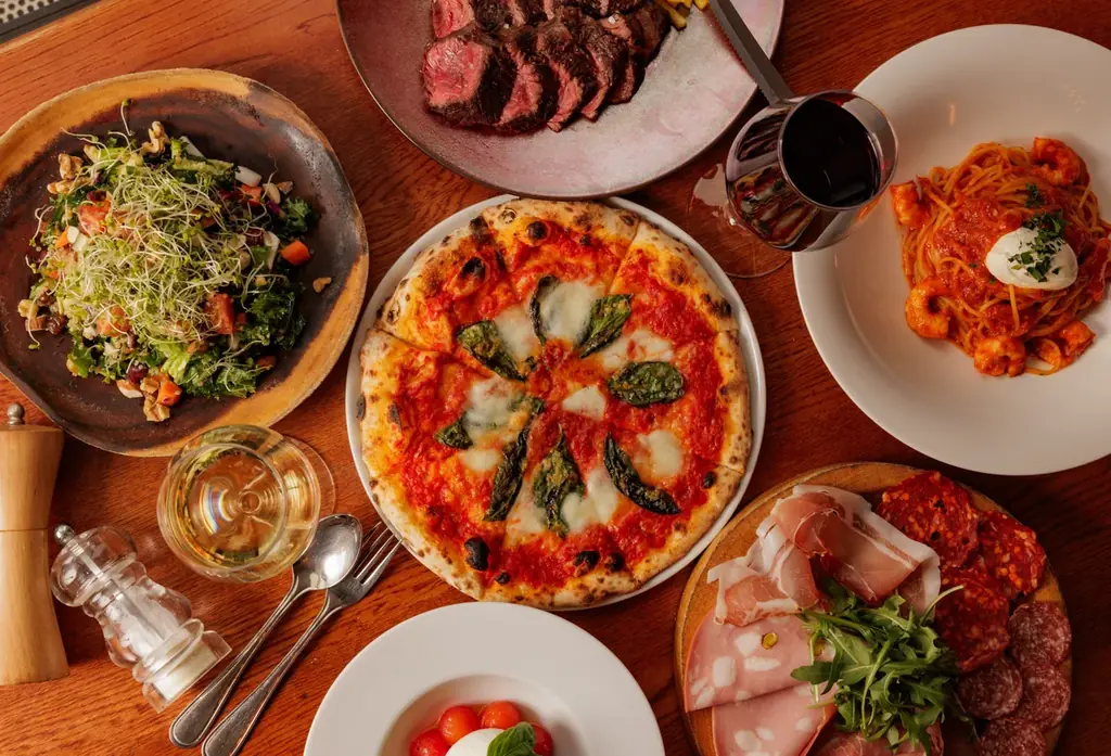 提供メニューはイタリアンを中心に、創業時からの定番である明太子パスタ、カルボナーラ、シーザーサラダ、ティラミスといった品目が据えられています。ピッツァは窯で焼き上げるスタイルで、ワインに合わせたアペタイザーも用意されます。