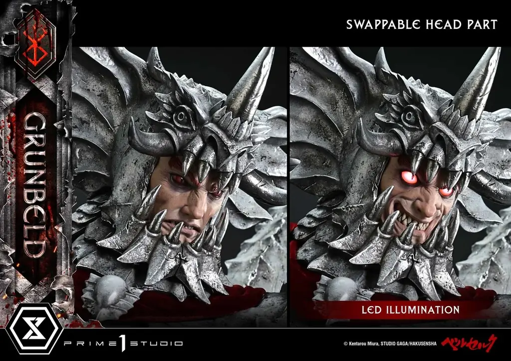 ベルセルク グルンベルド グルンベルド VS ガッツ ボーナス版 | ¥303,490 | 2026年12月~2027年3月 | 500 | 1/4 Scale 全高:107cm 全幅:82cm 奥行:78cm | 40.9㎏ | ポリストーン(一部に別素材使用) | 頭部×2(真顔、笑み:LED)、特製ベース、LED(笑み)、ボーナス:素顔頭部(兜なし) | 日本国内:プライム1スタジオ公式オンラインストア(ボーナス版取り扱い) 製品ページ |