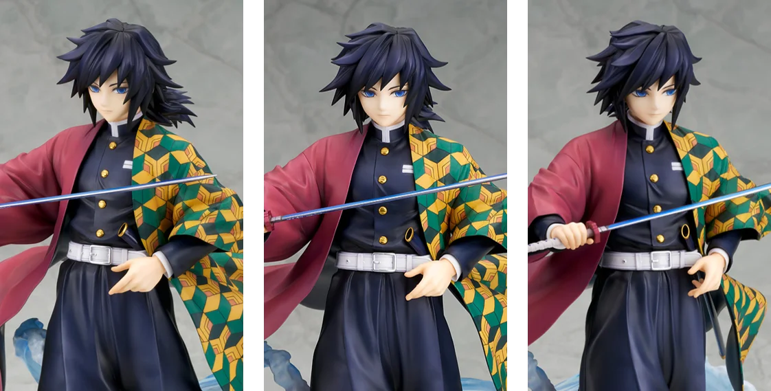また、無造作に束ねた髪の細部や武骨な手の表現、日輪刀を構える手の角度や力の入り方など細部造形に注力している点が明記されています。羽織の動きと隊服の造形による対比も造形面の重要な要素です。