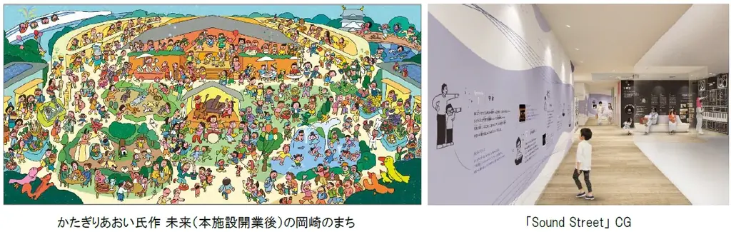 館内共用通路には「OKAZAKI STREETS」として3つのコンセプトストリートを設けます。Community Streetでは地元学生や住民参加の作品を紹介、Sound Streetでは冨田勲氏の功績紹介や立体音響体験と校歌などの音源を再生、Green Streetでは太陽光発電量など環境配慮の取り組みを数値で提示する計画です。