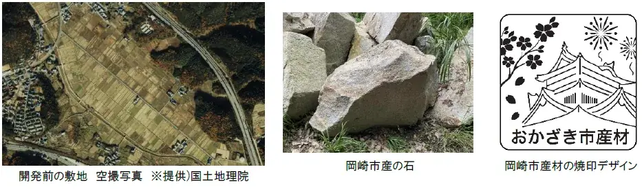 館内には岡崎市のPRコーナーを設け、市の情報発信に寄与する予定です。施設内の設計や外構には地域の原風景や地元資源を取り入れる工夫があり、岡崎市産の石材や木材を用いたサイン・ベンチ・家具の配置、敷地緑化として中高木約180本、低木約11,300株の植樹が計画されています。