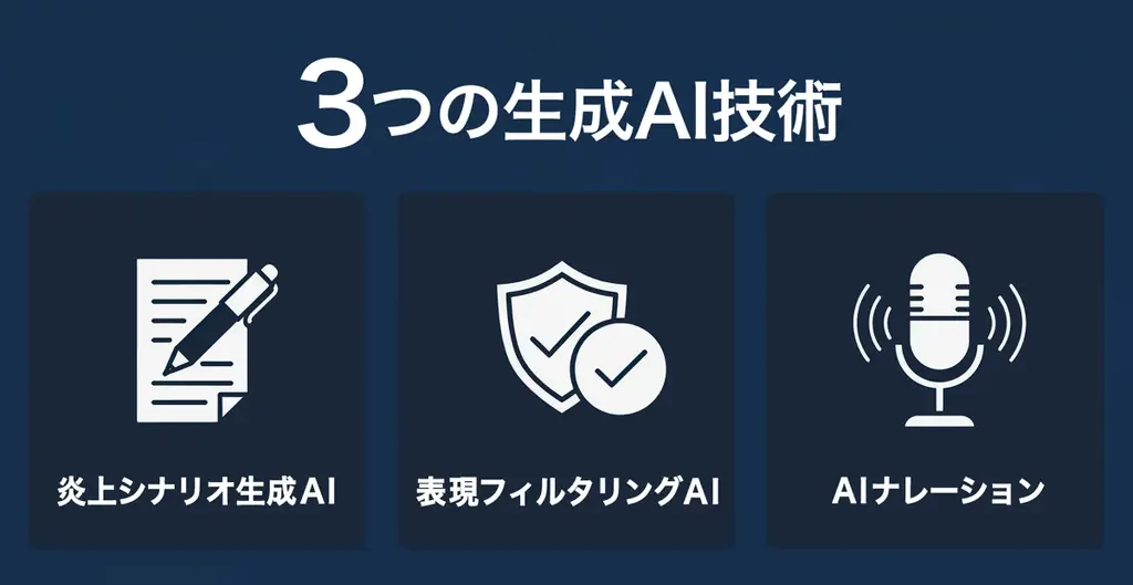本企画は主に3種類の生成AI技術で支えられています。これらは互いに補完し合い、リアリティのある炎上体験を作る一方で、安全性とブランド保護のための機能も組み込まれています。