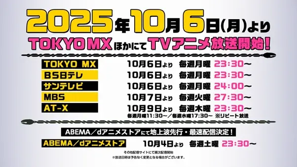 先行配信 | ABEMA・dアニメストア(1次先行):2025年10月4日 毎週土曜23:30〜 |