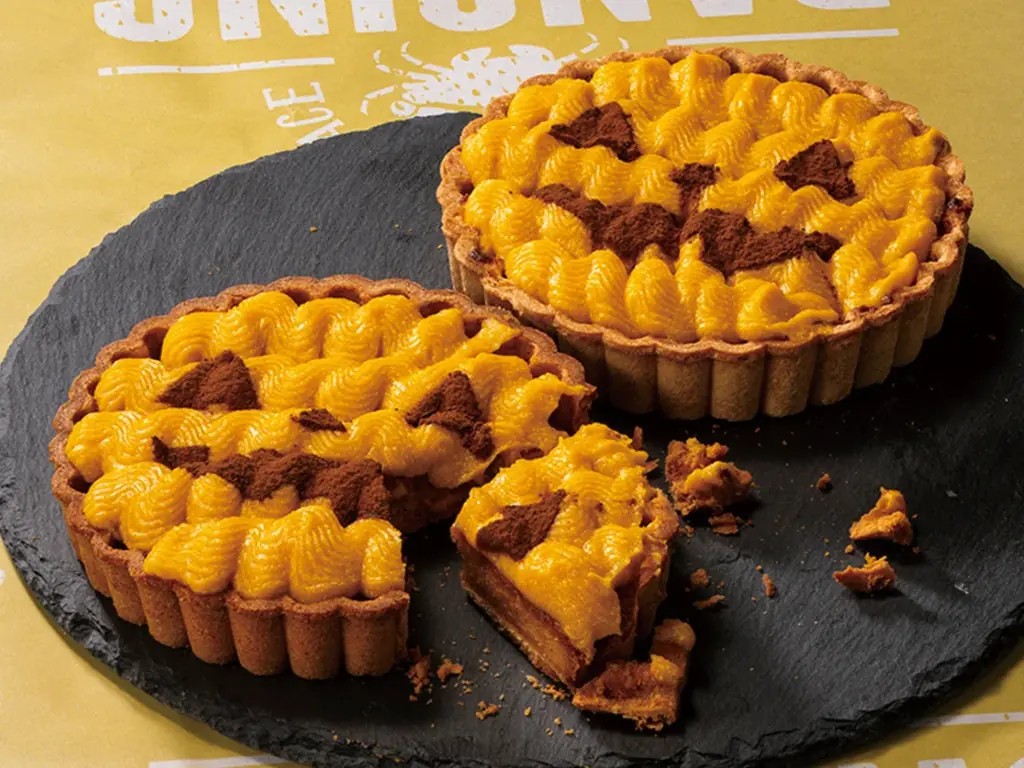 - ジャック・オ・スイートタルト:1個 税込1,000円。パンプキンクリームをやさしい甘さで仕上げ、ココアパウダーでジャック・オ・ランタンの表情を描いたタルトです。