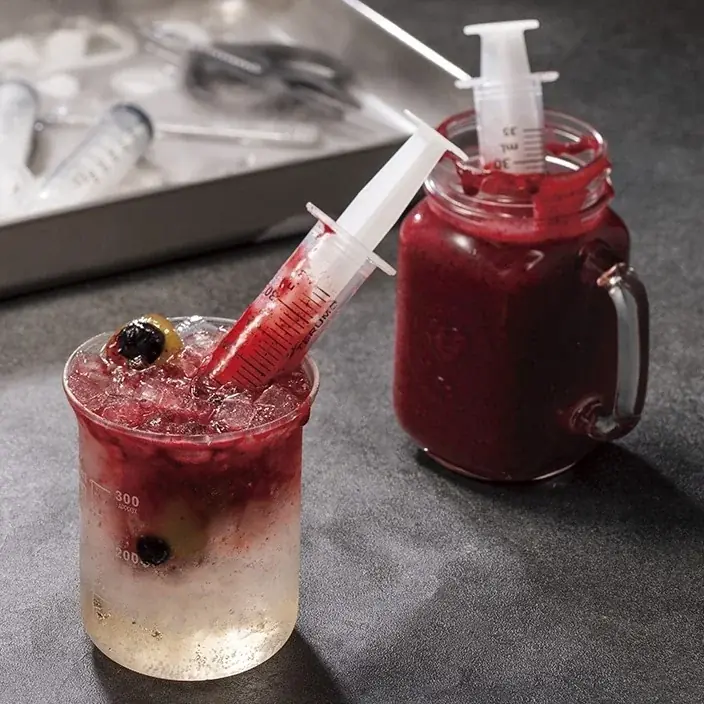 - Dr.ジキルのブラッディクーラー:税込1,000円。ホワイトラムとジンジャーエールをベースに、”血液”に見立てたミックスベリーのフロートを注入する演出があり、ブドウで作った目玉を添えたドリンクです。