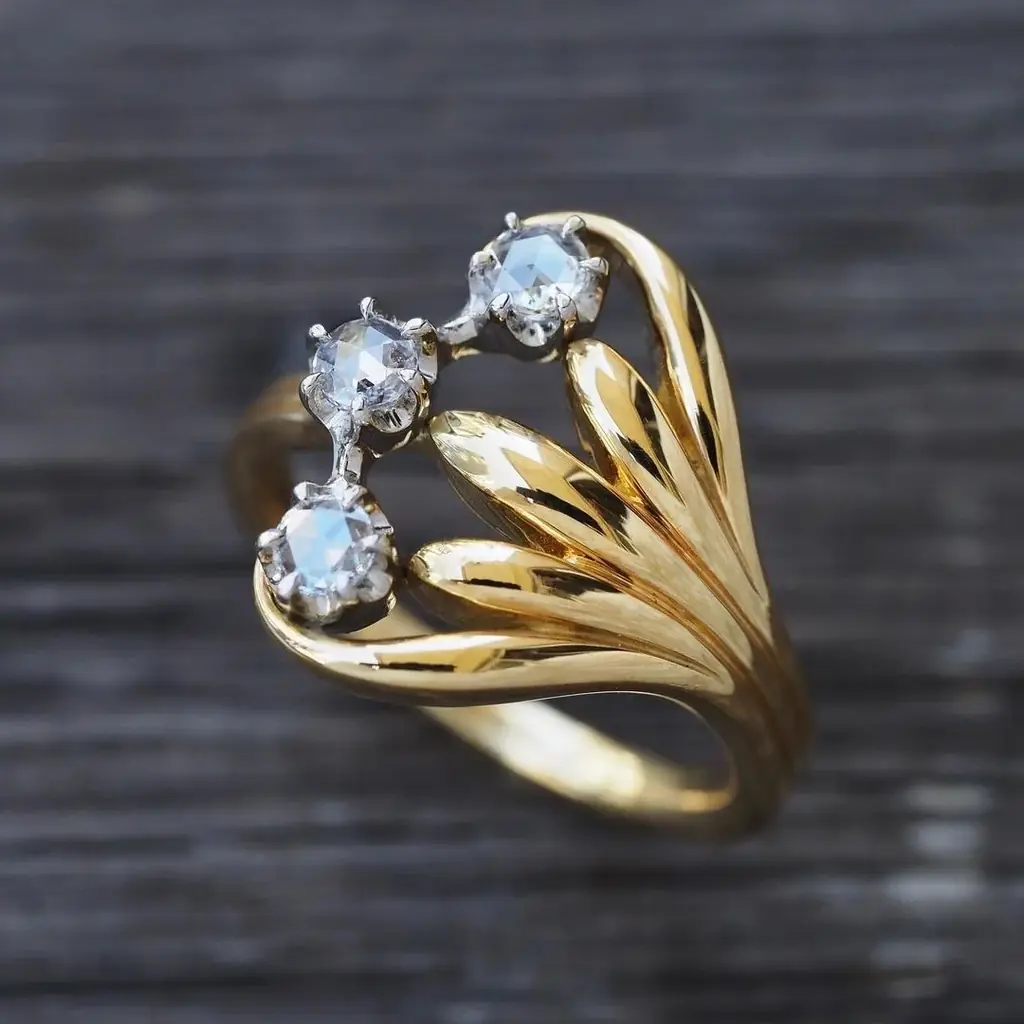 - ヴィクトリア時代の意匠を取り入れたボリュームリング。プラチナのリーフモチーフと散りばめられたダイヤモンドが特徴。価格は税込251,900円より(Pt950/K10YG・天然石)。