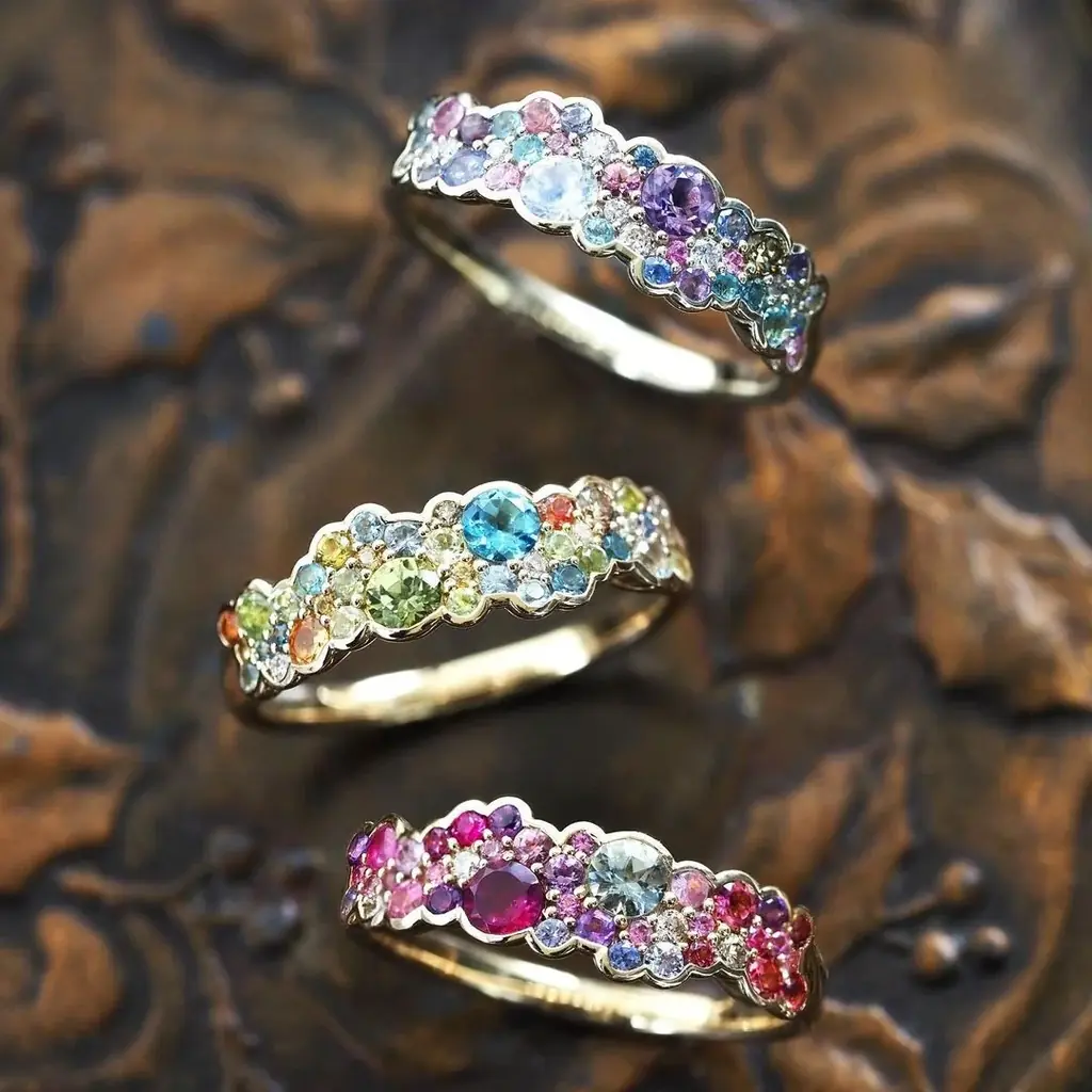 - 直径約6mmの小さな枠に多彩な宝石を組み合わせるパヴェ発想のシリーズ。石のサイズと高さを厳密に計測し、0.1mmの誤差も許さない精度で配置します。リングやペンダント等のアイテムが可能。価格は税込94,600円より(K10YG・天然石・ダイヤモンド)。