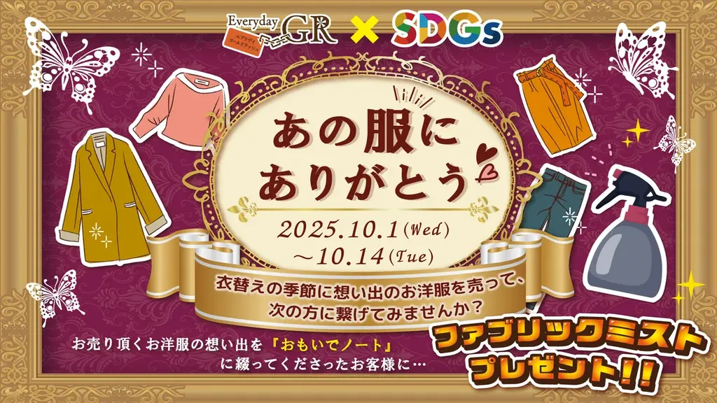 企画名は〈お売りいただく衣類の想い出を弊社独自の「想い出ノート」に記入していただくと高級ミストをプレゼント致します。〉となります。開催日は2025年10月1日から10月14日、開催場所はエブリデイゴールドラッシュ全店(8店舗)です。