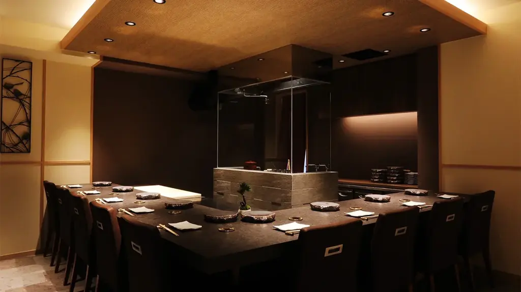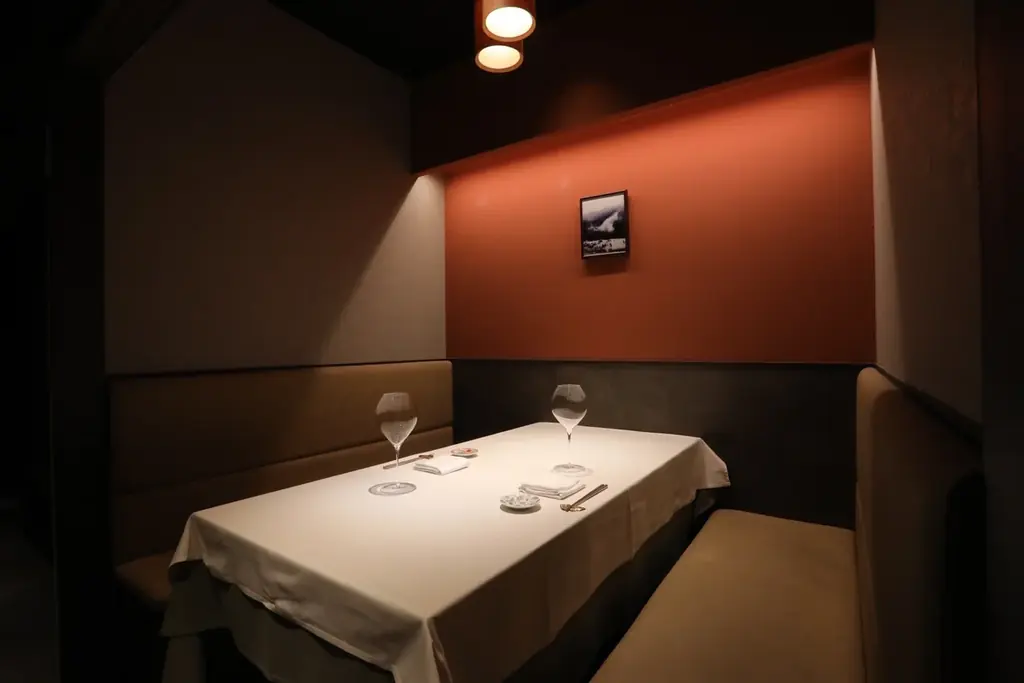 店舗は銀座の中心地、第五太陽ビルの2階に位置します。カウンター席と個室を組み合わせ、静かな会食に適した設計がなされています。