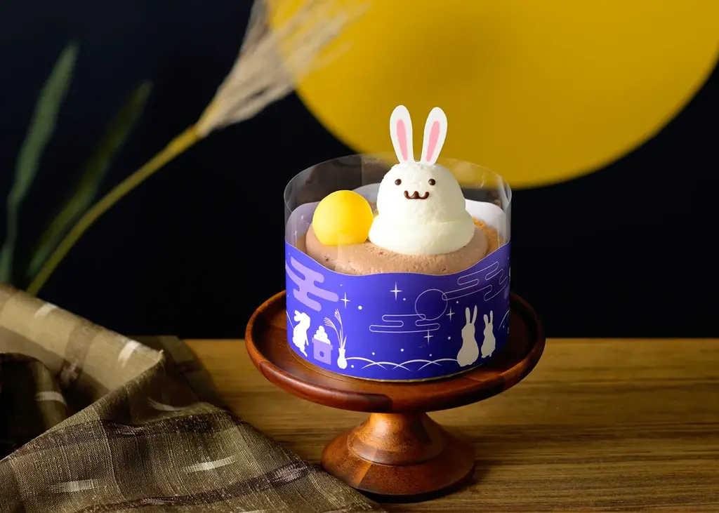 まんまるの形状は満月を象徴しており、上にのせた黄色いチョコレートは「まんまるお月さま」を表現しています。白いうさぎは練乳風味クリームで再現され、丸い月の上でお月見をする情景を思わせる造形です。