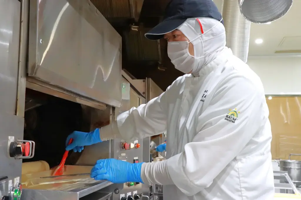 - バームクーヘンの見た目、食感、食味に関する社内の厳しい基準を満たした熟練職人を社内で認定した称号です。原料や生地、焼成に関する知識を持ち、新商品開発や技能伝承を担います。左腕への刺繍がばあむマイスターの証とされています。