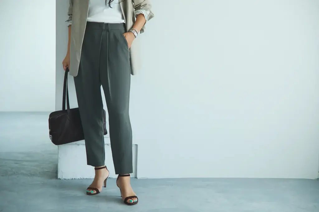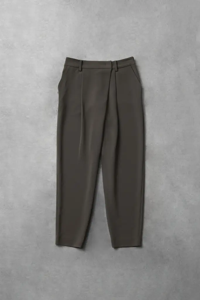 SOÉJUのタックパンツは、すっきりとした見た目と洗練された大人の印象を両立する名品として評価されている。最大の特徴は片側の生地をクロスして合わせるラップデザインである。ウエストから斜めに流れるラインが視覚的なアクセントとなり、特別なテクニックを要さずに洒脱なスタイルが完成する。
