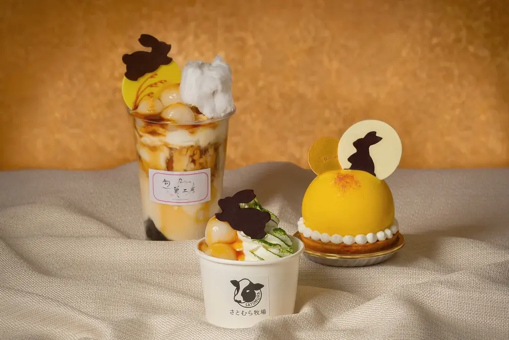 提供場所はホテル1階のケーキブティック「Pâtisseríe 旬菓工房」で、販売時間は毎日11:00〜19:00。地元・佐世保の「さとむら牧場」が生産するソフトクリームや、栗、求肥、あんなど和の素材を用いた3種類のスイーツが揃います。いずれの品にも、月とともに暮らす動物を象徴するモチーフとして、うさぎのシルエットをかたどったチョコレートがあしらわれています。