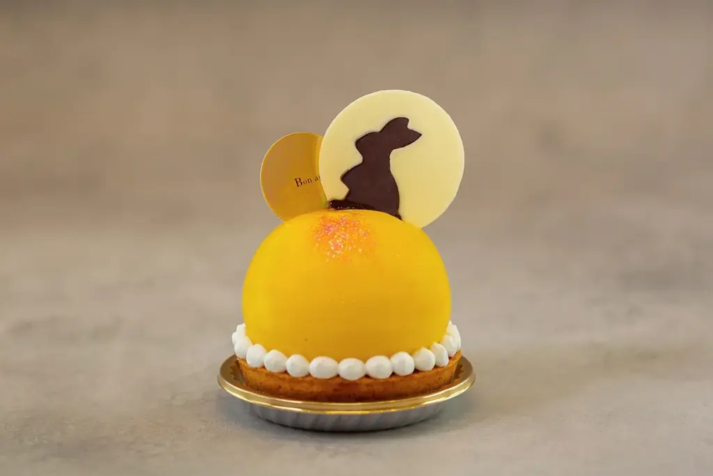 エッグタルトのしっかりとしたベースに、栗の甘露煮、求肥ボール、つぶあんを閉じ込めたマロンムースを重ねた一品です。全体は満月を想起させる丸いフォルムにまとめられ、月とウサギを形どったチョコレートが添えられます。