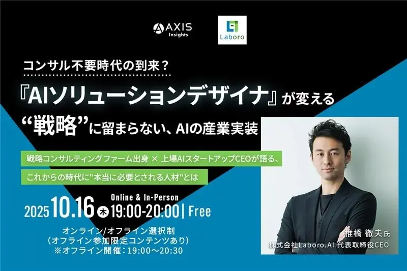 アクシスコンサルティング株式会社は、2025年10月16日(木)午後7時から午後8時30分にかけて、ウェビナー「コンサル不要時代の到来?『AIソリューションデザイナ』が変える“戦略”に留まらない、AIの産業実装」を開催します。プレスリリースは2025年9月16日11時00分に発表され、本稿ではイベントの目的、登壇者の背景、議題と参加に関する具体的な情報を網羅的に整理して伝えます。