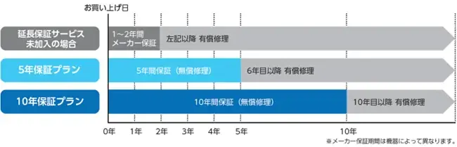 メーカー保証の期間を含めて、お買い上げ日から最長10年まで延長可能です。追加費用は対象商品ごとに定められますが、わずかな費用で長期サポートが受けられる点が特徴です。