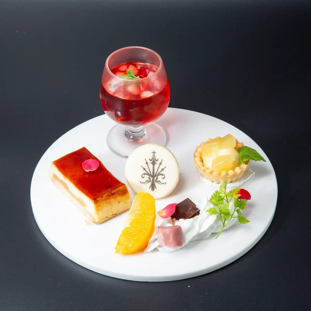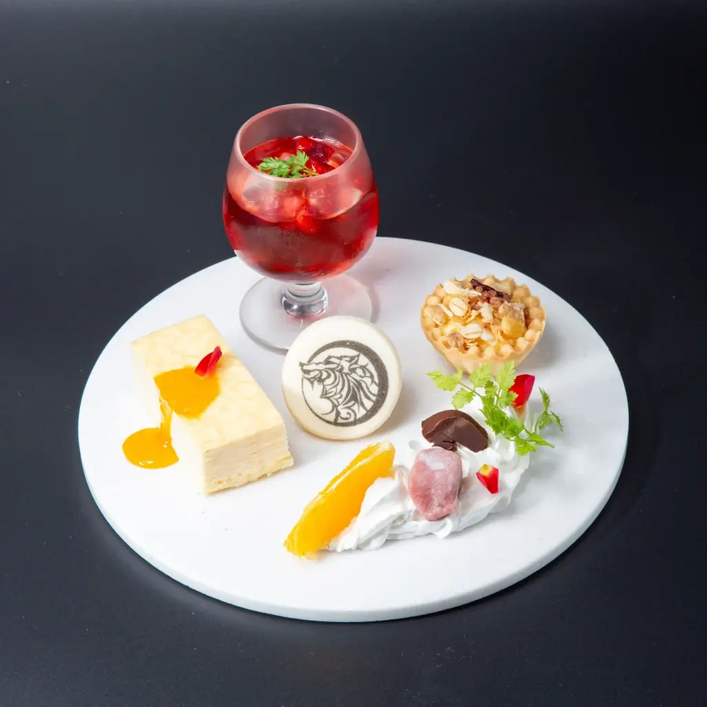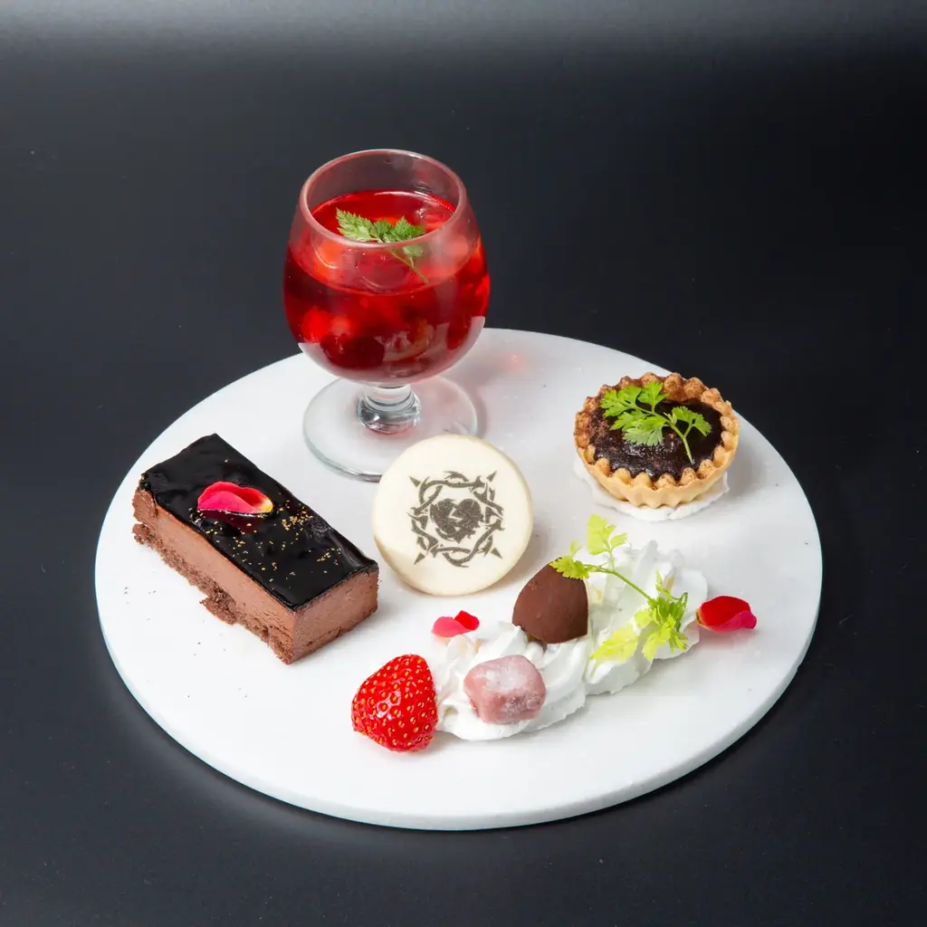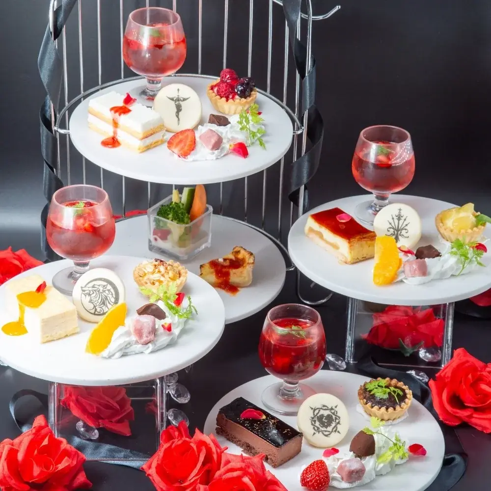 メニュー内容 | 各家をモチーフにした上段スイーツ(家紋クッキー、2色生チョコ、血の杯 など)/下段セイボリー(キッシュ、ツナのブリニ、バーニャカウダ) |