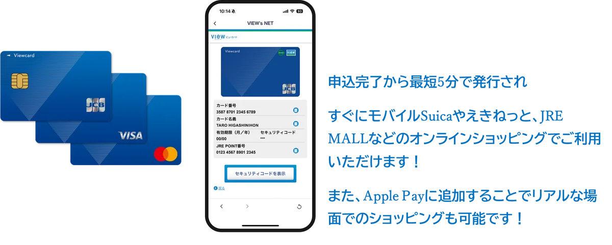 即時発行(バーチャルカード)は、スマートフォンで申込みを完了すると、最短で5分でカード情報が発行され、発行されたカード番号等はビューカードアプリで確認できます。これにより、申込当日からモバイルSuicaでのチャージや定期券購入、えきねっとでのきっぷ購入、JRE MALLなどのオンラインショッピングなどが利用可能です。後日、プラスチックカードが自宅に郵送されます。