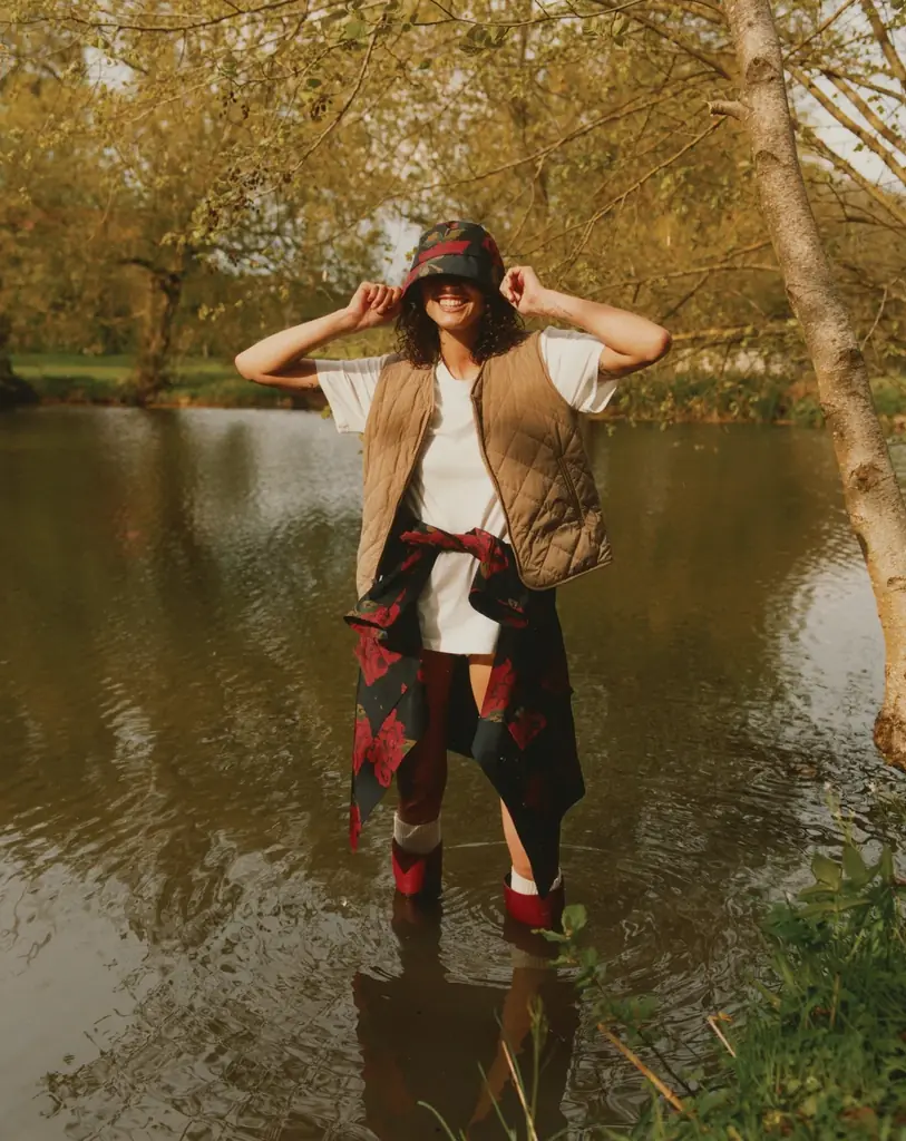Roujeのアイコニックなフローラルプリントが施され、AIGLEの機能的な撥水処理によって突然の雨にも対応可能です。傘が使いにくい状況や動きのある場面でもスタイルを維持することに注力しています。
