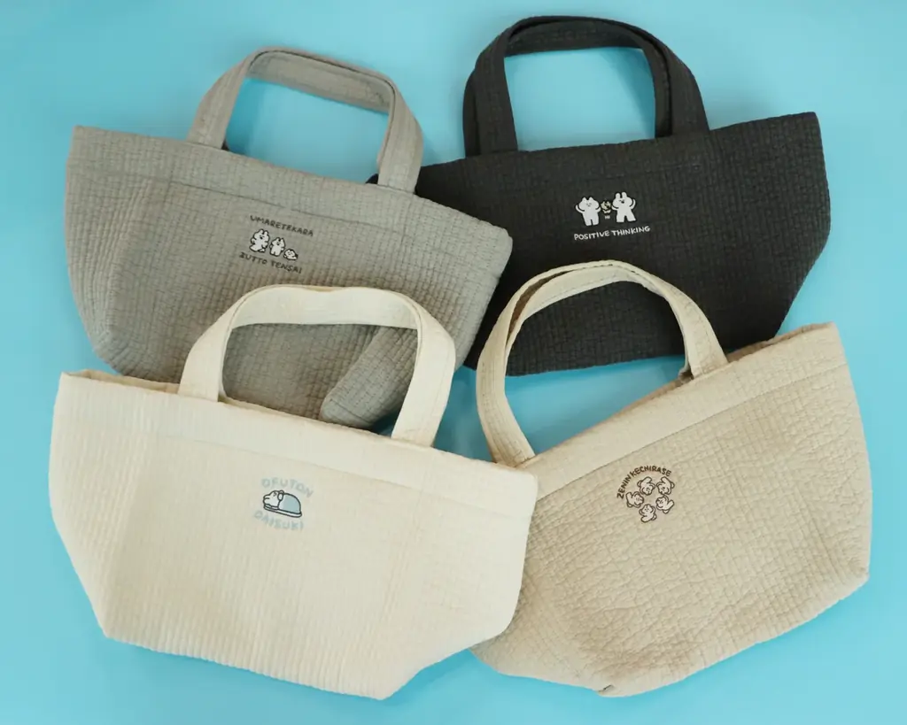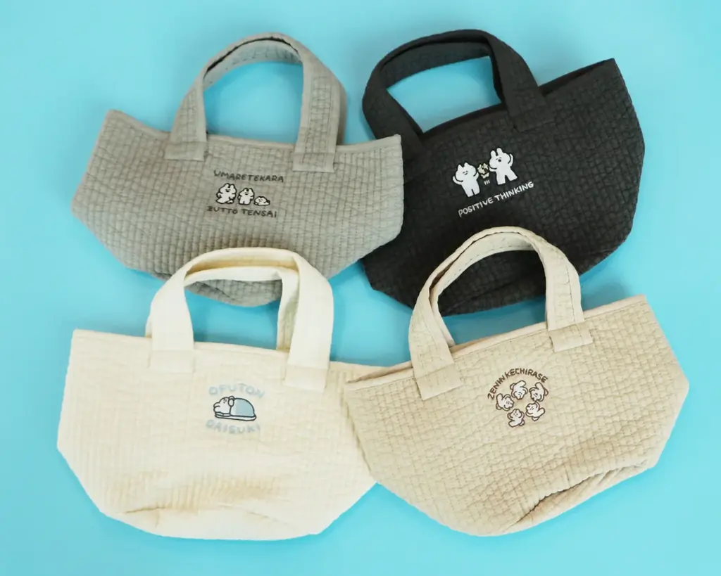 今回のコラボアイテムは、susabiで人気のヌビバッグ(イブル生地を用いたキルティング素材)をベースに、全4種類の刺繍ワッペンを配した限定デザインです。刺繍のセリフはローマ字表記にすることで、デザインの調和を保ちつつ日常で使いやすいビジュアルに調整されています。
