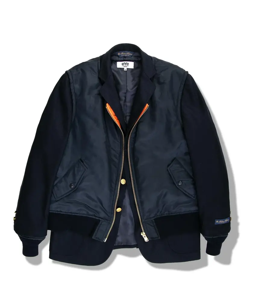 ブレザー(+ベスト) | ¥242,000 | ブレザー:ウール97%、カシミア3% ベスト:ナイロン100% | 段返り3釦サック、MA-1ディテールのナイロンベスト、オレンジライナー、ゴールデン フリースのメタル釦 | 2025年9月20日(土)より順次 全国のJUNYA WATANABE MAN正規取扱店、表参道店・大阪店(数量・店舗限定) |