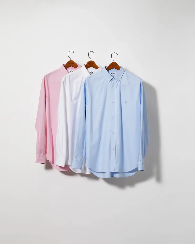 ボタンダウンシャツ | 各¥60,500 | スーピマコットン100% | 洗い加工オックスフォード、ホワイト/ブルー/ピンク、左胸にトーナルのゴールデン フリース、襟小さめ | 2025年9月20日(土)より順次 同上 |