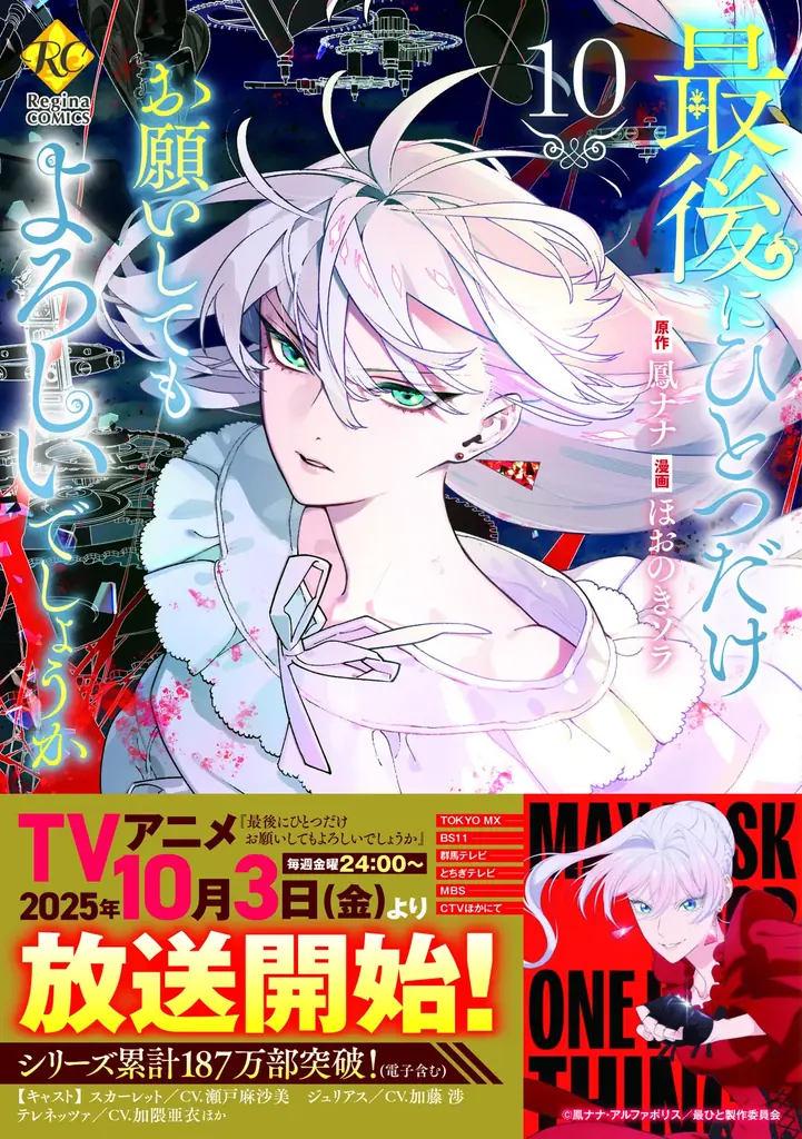 株式会社アルファポリスは、鳳ナナ氏の小説『最後にひとつだけお願いしてもよろしいでしょうか』(レジーナブックス)がTVアニメ化されることを、2025年9月16日付で発表しました。シリーズは漫画・電子を含めて累計187万部を突破しており、アニメ化発表とあわせて配信プラットフォームや放送局、PVの公開、そしてコミックス第10巻発売記念のコラボカフェ情報など、各種展開が一斉に告知されています。