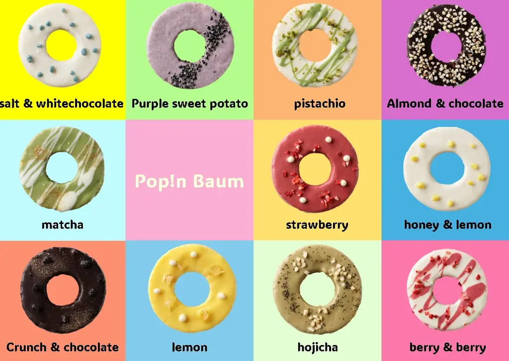 - ミニサイズのバームクーヘンに複数のフレーバーとトッピングを組み合わせることで、見た目の彩りと個別パッケージでの配布に適した商品設計。