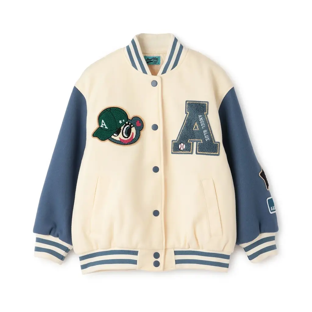 立体感のあるナカムラくんのサガラ刺しゅうワッペンを配したスタジャンです。胸元には「A」ロゴ、袖には星形ワッペンをあしらい、チアー風の明るいデザインで仕上げています。ゆったりしたシルエットと重ね着しやすい構造により、秋のライトアウターや冬の重ね着アイテムとしての使用が想定されています。