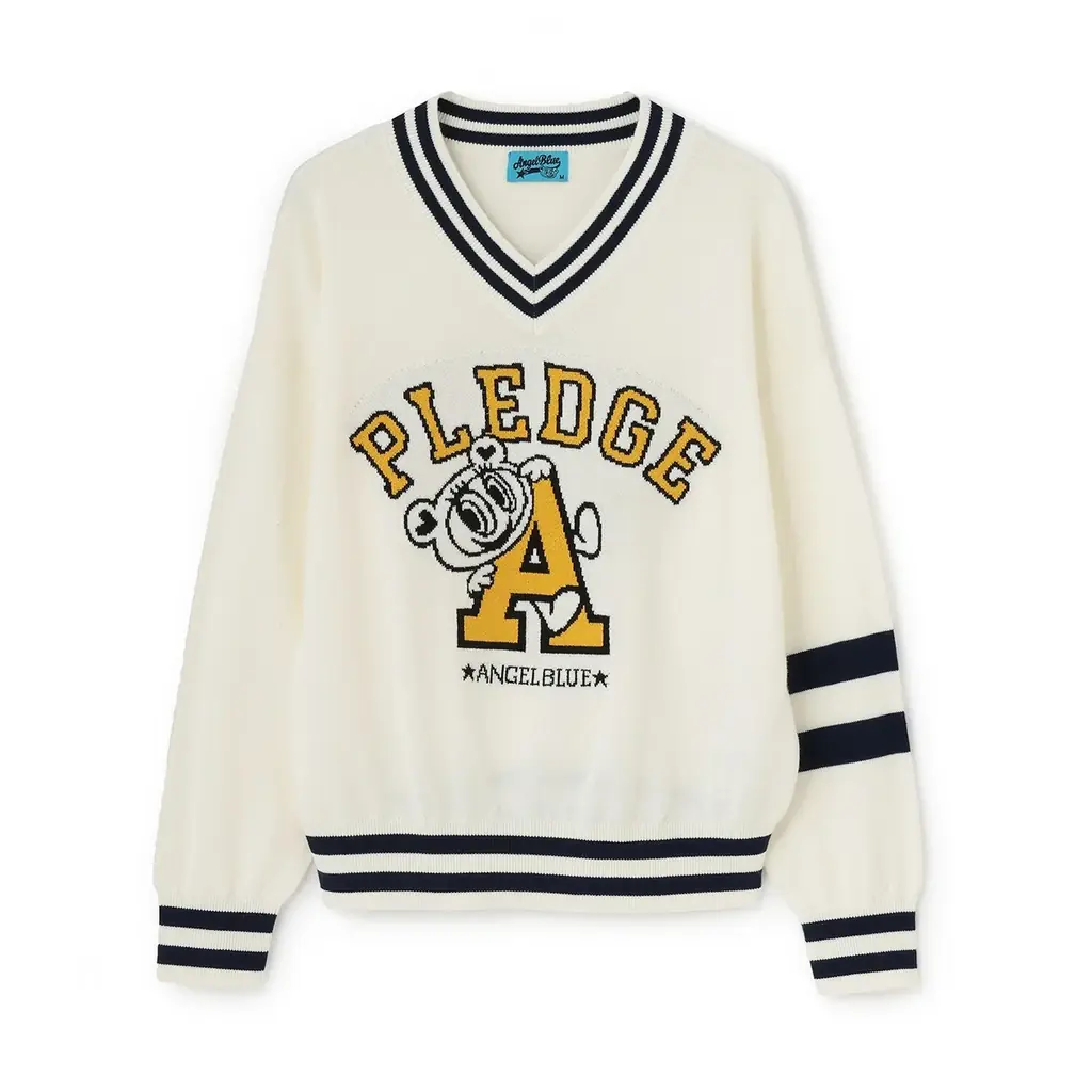 カレッジロゴ入りのチルデンセーターで、フロントに大きなロゴとナカムラくんを配置し、左袖とリブにはストライプラインを入れてプレッピーテイストを強めています。一枚でもレイヤードでも活用でき、スクールガール的な雰囲気を表現しやすいアイテムです。