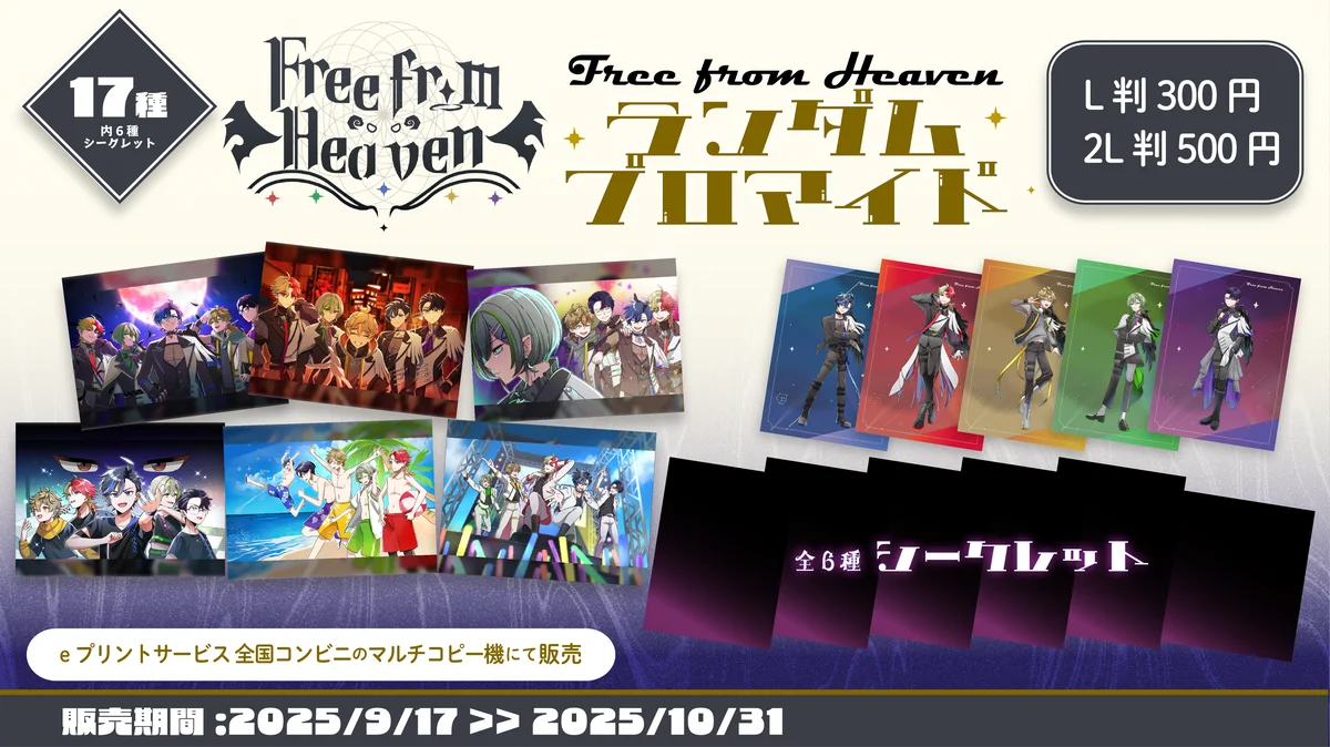 ブロマイド販売 | サービス:eプリントサービス(全国コンビニのマルチコピー機) 販売期間:2025年9月17日〜2025年10月31日 種類:全17種(シークレット6種含む) 価格:L判 300円、2L判 500円(いずれも税込) 詳細:https://entame.e-printservice.net/content_detail/free_from_heaven |