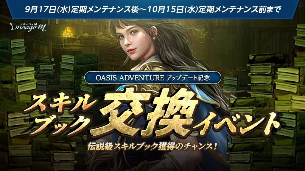 スキルブック交換イベント | ショップ→名誉コインタブで伝説級/英雄級スキルブック系アイテムを販売。伝説級は選択式の箱で選択可能 | 2025/9/17 定期メンテ後 ~ 2025/10/15 定期メンテ前 |