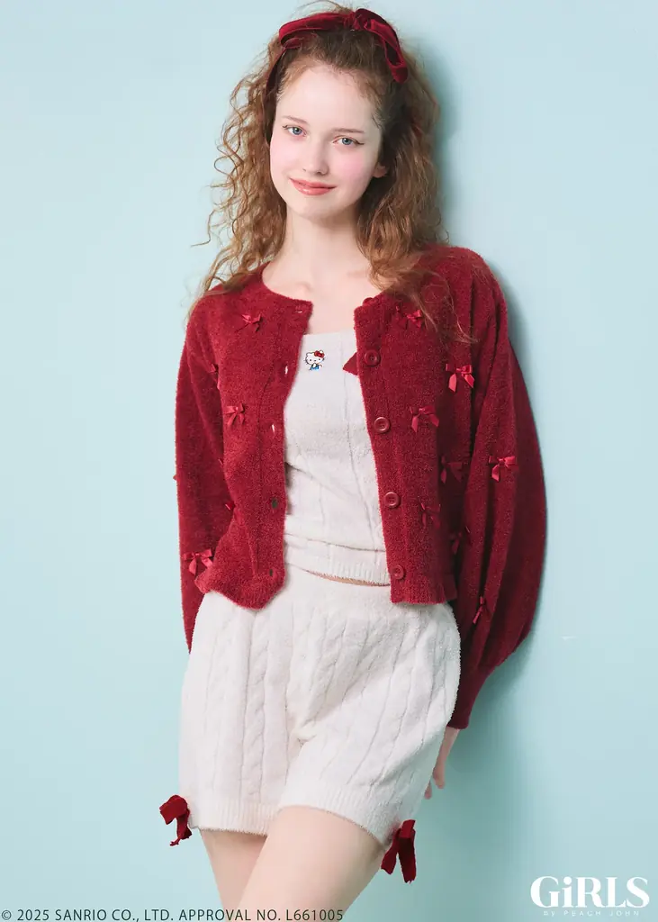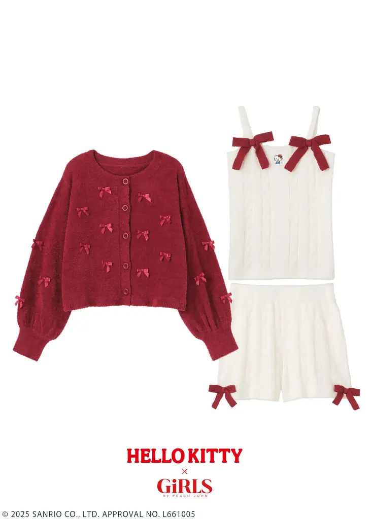 キャミソールには胸元のハローキティ刺繍、カーディガンにはリボンを多用した遊び心のあるデザインが施されています。キャミソール単体での着用も想定された使い勝手の良い構成です。