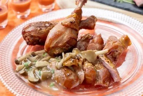 - 皮はパリッと、身はジューシーにローストした骨付き鶏もも肉に、数種類のきのこや香草の風味を活かしたきのこソースを合わせたアジアンテイストの肉料理です。
