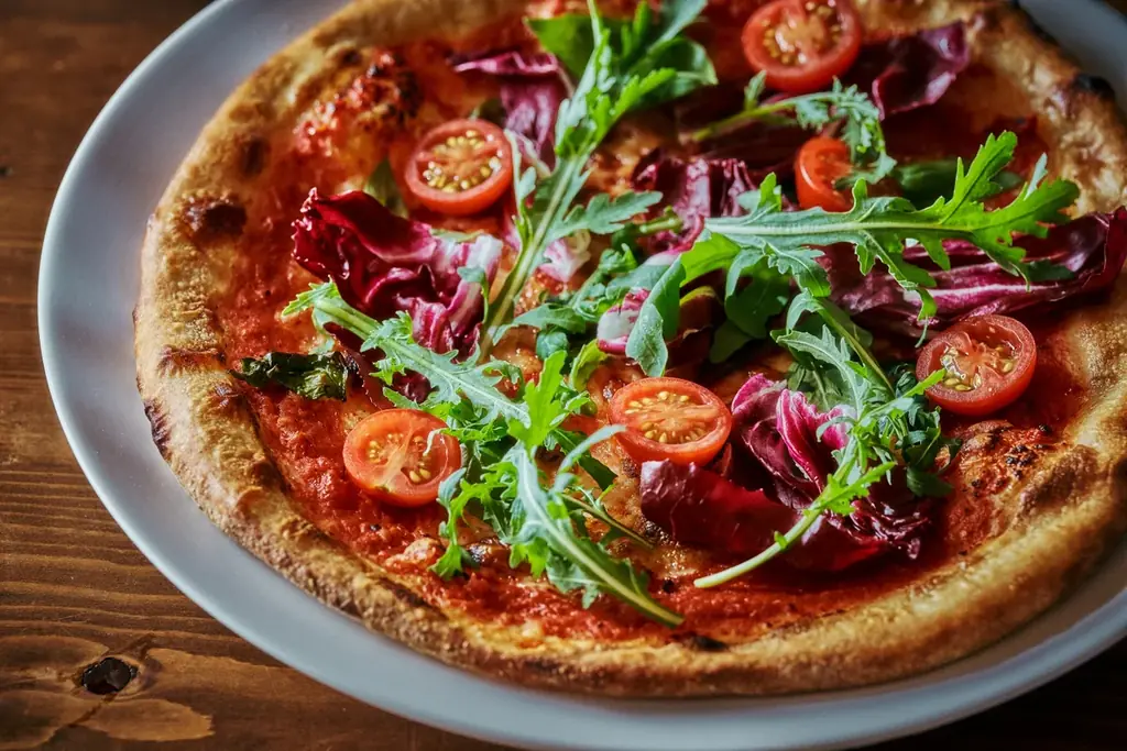 看板料理は石窯ピザで、もちもちでやや厚めのナポリ風生地に旬の野菜をたっぷりのせて焼き上げます。レギュラーメニューに加え、日替わりピザが用意される場合もあります。