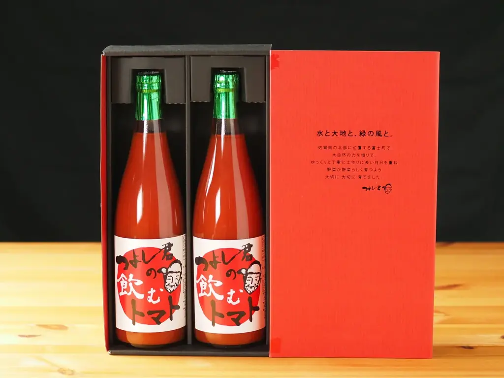 - つよし君の飲むトマト 1本 1,700円(つよし君のお野菜畑):有機栽培で育てた完熟トマトのみを原料とした無添加ジュース。防腐剤・塩・水を添加せず、トマトらしい酸味と香り、後味のうまみが特徴。