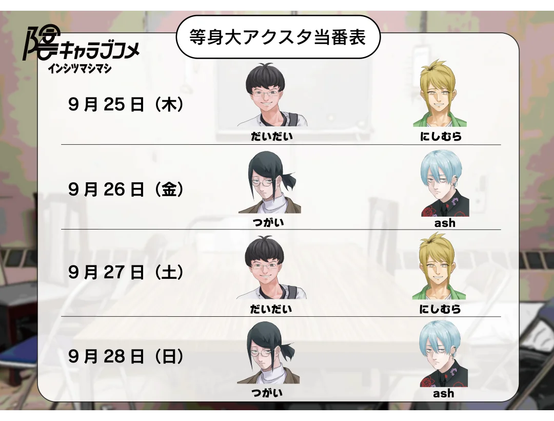 会場では、初お披露目となる『INKY(陰キャ)診断』を実施し、診断結果をSNSでシェアした方全員に限定オリジナルグッズをプレゼントします。試遊台の横には登場キャラクターの等身大アクリルスタンドを日替わりで展示し、作品世界の雰囲気を体感できる構成です。プレゼントは数量限定で、なくなり次第終了します。