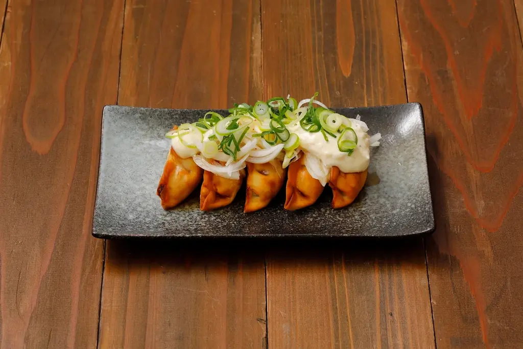 - キムチ餃子南蛮(李朝園のキムチ餃子を使用):李朝園のキムチ餃子を揚げ、タルタルと甘酢をかけた南蛮風アレンジ。キムチの辛味とタルタルのまろやかさが特徴。