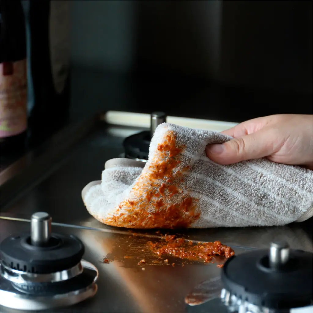 使用後は軽くすすぐだけで油汚れがきれいに落ちるため、繰り返し清潔な状態で使用可能です。吸水力が高く、テーブルや水回り、子どもの食べこぼしなど日常的な汚れに幅広く対応します。