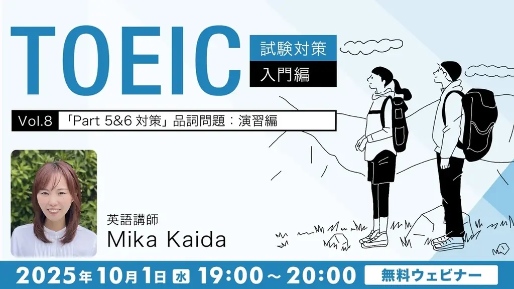 - Vol.8「Part 5&6対策 品詞問題:演習編」:開催日 2025年10月1日(水)19:00~20:00。申込締切:2025年10月1日(水)20:00。詳細・申込:https://www.creativevillage.ne.jp/category/crv_event/165577/