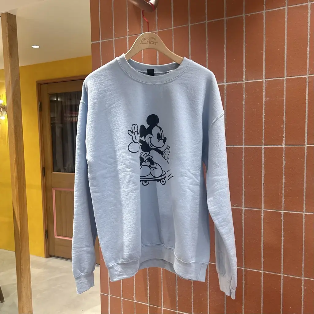 アウトドアプロダクツ ユージュアルシングス(5F) | WIFFLE ex SkateBoard Mickey(スウェット) | 10月16日(木)発売 | 税込13,200円 | ミッキープリントのスウェット。グレー、ブラックに加え、横浜店限定のブルー(古着加工によるヴィンテージ風)を用意。 |